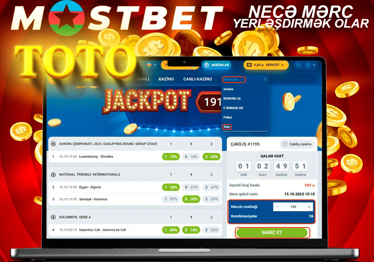 Mostbet TOTO-da qazanc əldə etmək üçün istifadəçi ən azı 9 hadisənin nəticəsini proqnozlaşdırmalıdır. Uduşlar cari tirajda nəzərdə tutulmuş mükafat fondu əsasında hesablanır. Müştəri bütün 15 hadisənin nəticələrini təxmin edə bilsə, inanılmaz bir cekpot alacaq. Uduşun miqdarı itirilən hər tirajla artır.